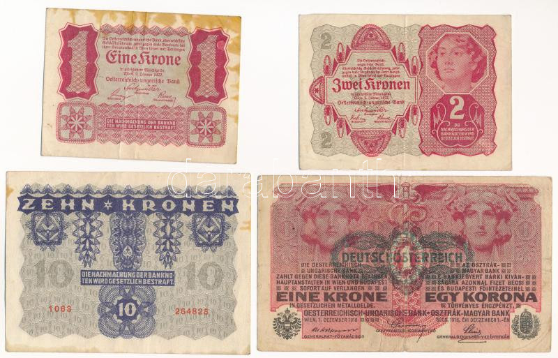 Ausztria 1922. 1K + 2K + 10K + 1916. 1K zöld ‘DEUTSCHÖSTERREICH’ felülbélyegzéssel T:III fo. Austria 1922. 1 Krone + 2 Kronen + 10 Kronen + 1918. 1 Korona with green ‘DEUTSCHÖSTERREICH’ overprint C:F spotted<a href="https://www.darabanth.com/hu/gyor