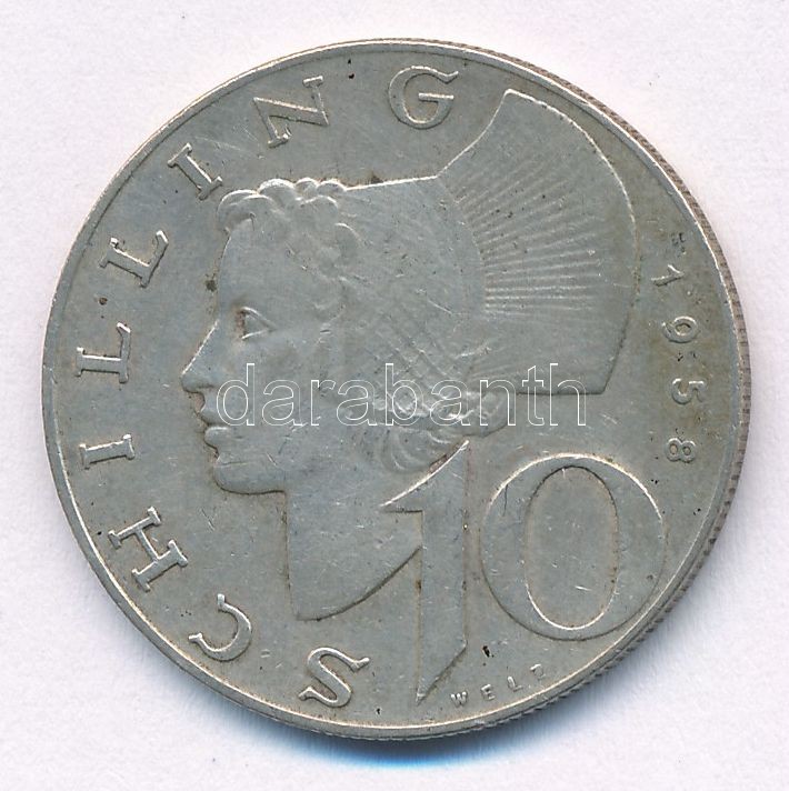 Ausztria 1958. 10Sch Ag T:2- Austria 1958. 10 Schilling Ag C:VF Krause KM#2882<a href="https://www.darabanth.com/hu/gyorsarveres/414/kategoriak~Numizmatika/Kulfoldi-fem-es-ezustpenzek~2000013/Ausztria-1958-10Sch-Ag-T2-Austria-1958-10-Schilling-Ag-CV