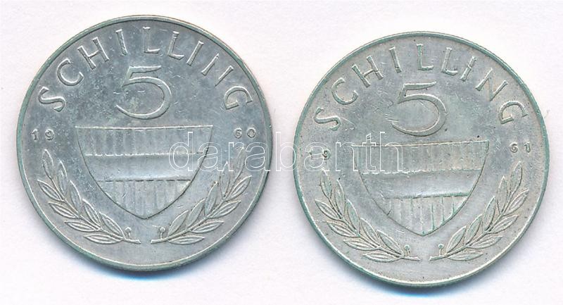 Ausztria 1960-1961. 5Sch Ag (2x) T:2 Austria 1960-1961. 5Sch Ag (2x) C:XF Krause KM# 2889<a href="https://www.darabanth.com/hu/gyorsarveres/412/kategoriak~Numizmatika/Kulfoldi-fem-es-ezustpenzek~1500014/Ausztria-1960-1961-5Sch-Ag-2x-T2-Austria-1960-