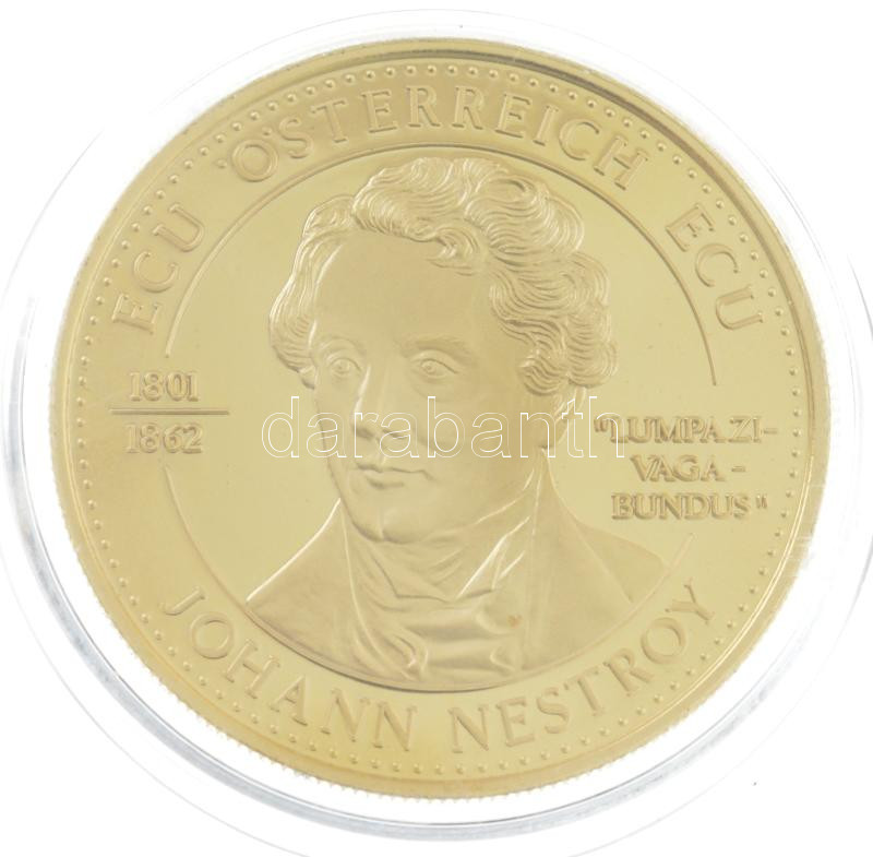 Ausztria ~1995. ‘ECU Österreich ECU – Johann Nestroy / Austria – Servus Europa’ aranyozott Cu-Ni emlékérem német nyelvű tanúsítvánnyal T:PP Ausztria ~1995. ‘ECU Österreich ECU – Johann Nestroy / Austria – Servus Europa’ gilt Cu-Ni
