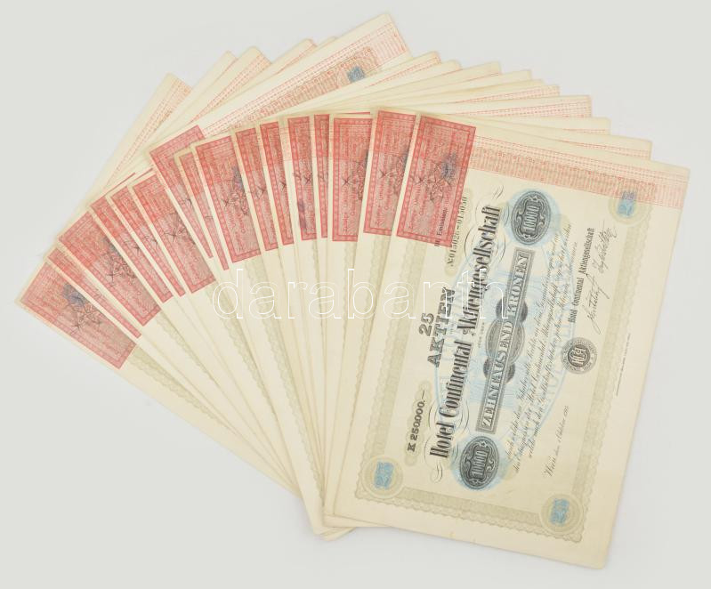 Ausztria / Bécs 1921. ‘Hotel Continental Részvénytársaság’ 25 részvénye egyben, összesen 10.000K-ról, felülbélyegzésekkel, szelvényekkel (19x), sorszámkövetők és közeli sorszámokkal T:I-,II széleken kis szakadások / Austria /