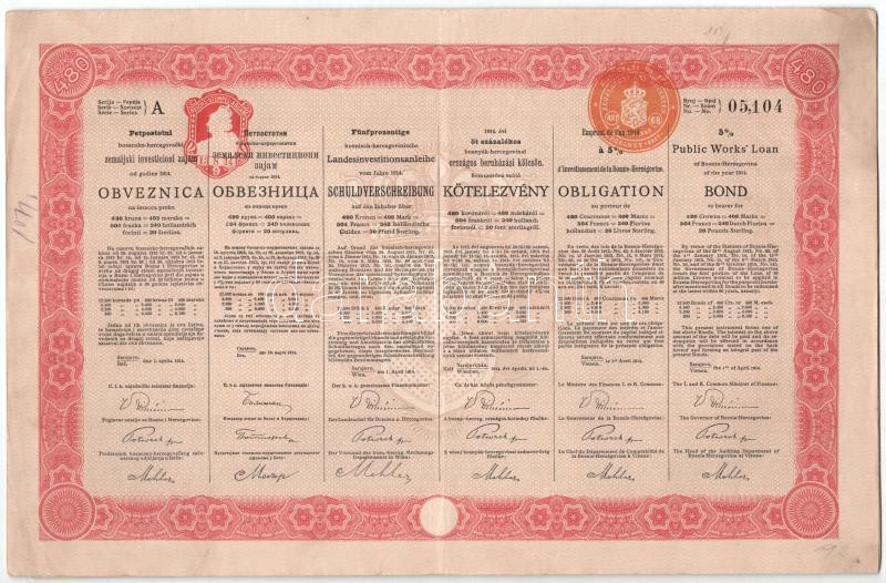 Ausztria / Szarajevó / Bécs 1914. ‘1914. évi öt százalékos bosnyák-hercegovinai országos beruházási kölcsön’ bemutatóra szóló kötvénye 480K-ról, szárazpecséttel, bélyegzéssel, szelvényekkel T:VF Austria / Sarajevo / Wien
