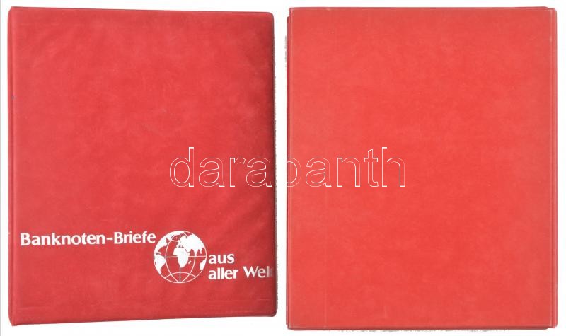 ‘Banknoten Briefe aus aller Welt’ piros, plüssborítású, négygyűrűs album berakólapok nélkül, plüssborítású tokban<a href="https://www.darabanth.com/hu/gyorsarveres/418/kategoriak~Numizmatika/Numizmatikai-kellekek~2000001/Banknoten-Briefe-aus-aller-W
