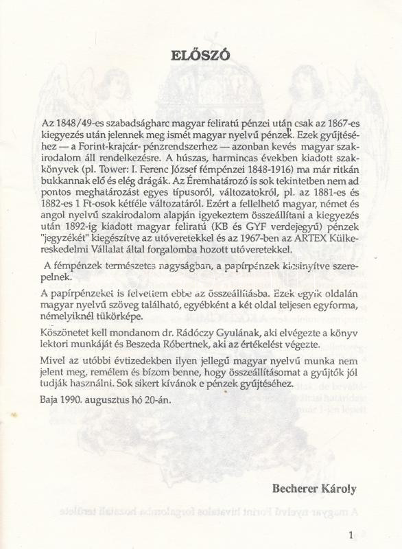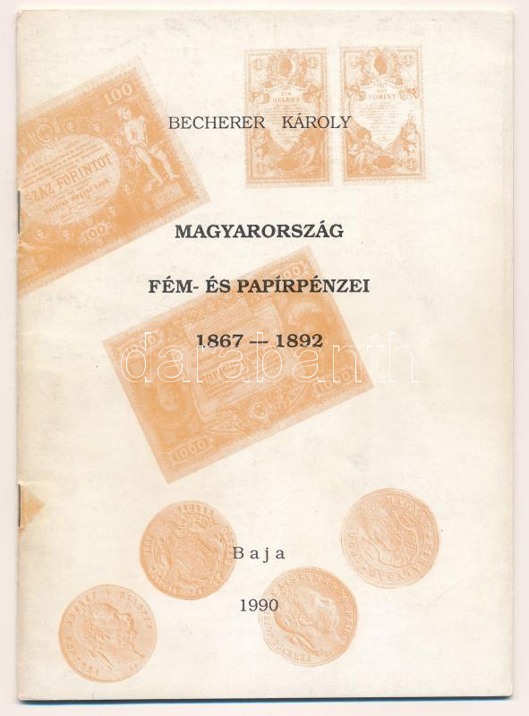 Becherer Károly: Magyarország fém- és papírpénzei 1867-1892. Baja, MÉE Bajai Csoportja, 1990.<a href="https://www.darabanth.com/hu/gyorsarveres/439/kategoriak~Numizmatika/Numizmatikai-irodalom~500002/Becherer-Karoly-Magyarorszag-fem-es-papirpenzei-1