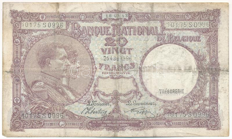 Belgium 1943. 20Fr T:III,III- kis sarokhiány, folt Belgium 1943. 20 Francs C:F,VG missing corner, spot Krause P#111