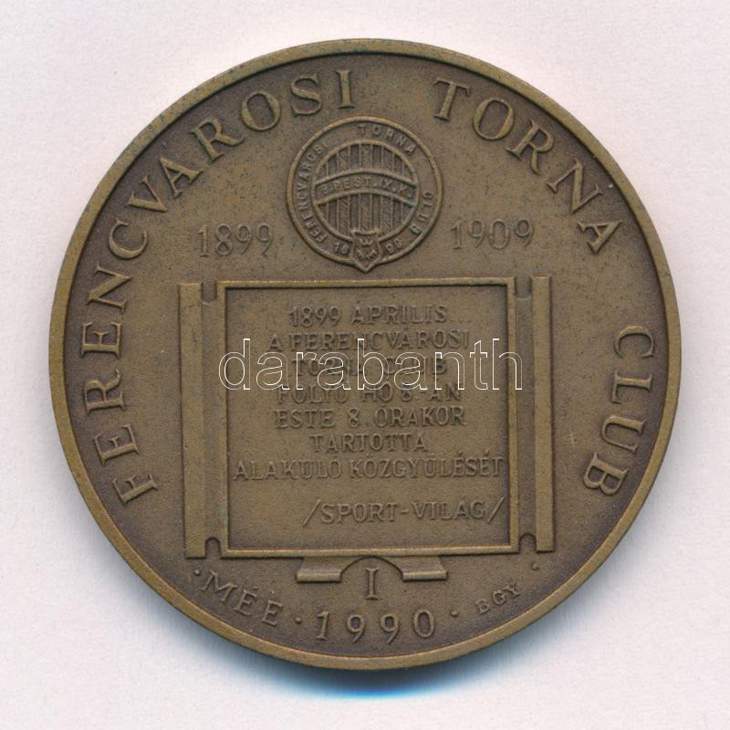 Bognár György (1944-) 1990. ‘MÉE – Ferencvárosi Torna Club FTC I. – 1899-1909’ kétoldalas bronz emlékérem (42,5mm) T:1 patina Adamo FTC1<a href="https://www.darabanth.com/hu/gyorsarveres/436/kategoriak~Numizmatika/Sportdijak-es-sport-emlekermek~1500