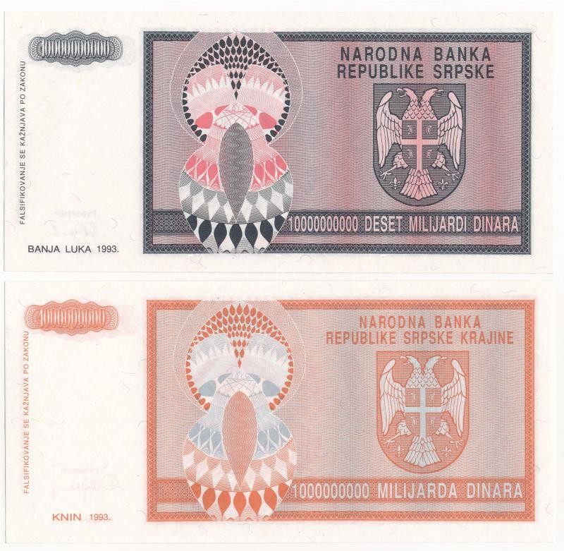 Bosznia-Hercegovina / Szerb Köztársaság / Banja Luka 1993. 10.000.000.000D sorszám nélkül + Horvátország / Krajna Szerb Köztársaság 1993. 1.000.000.000D sorszám nélkül T:I / Bosnia and Hercegovina / Serbian Republic / Banja Luka 1993.