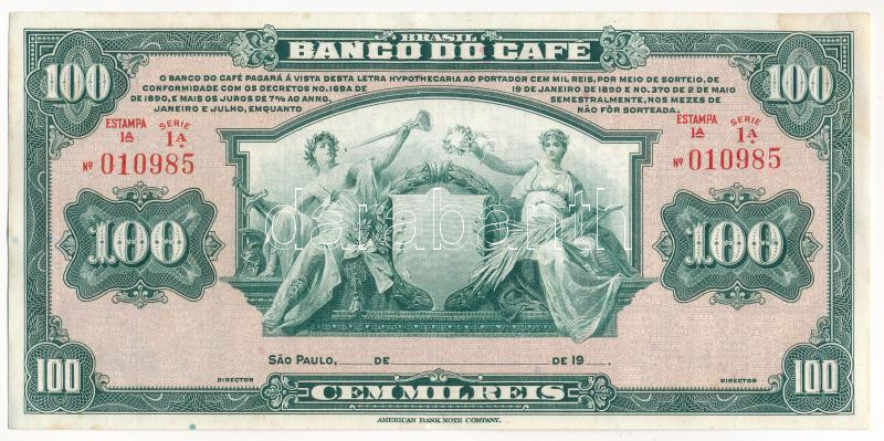 Brazília DN (1929) 100.000R jelzálogjegy T:I- folt Brazil ND (1929) 100.000 Reis Mortgage bills C:AU spot Krause P# S541<a href="https://www.darabanth.com/hu/gyorsarveres/436/kategoriak~Numizmatika/Kulfoldi-bankjegyek~2500001/Brazilia-DN-1929-100000