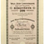 Budapest 1911. „Walla József Czementárugyár Részvénytársaság” részvénye 500K-ról szárazpecséttel, szelvényekkel T:AU / Hungary / Budapest 1911. „József Walla Cement Factory Share Company” share about 500 Korona with embossed stamp and coupons C:AU
