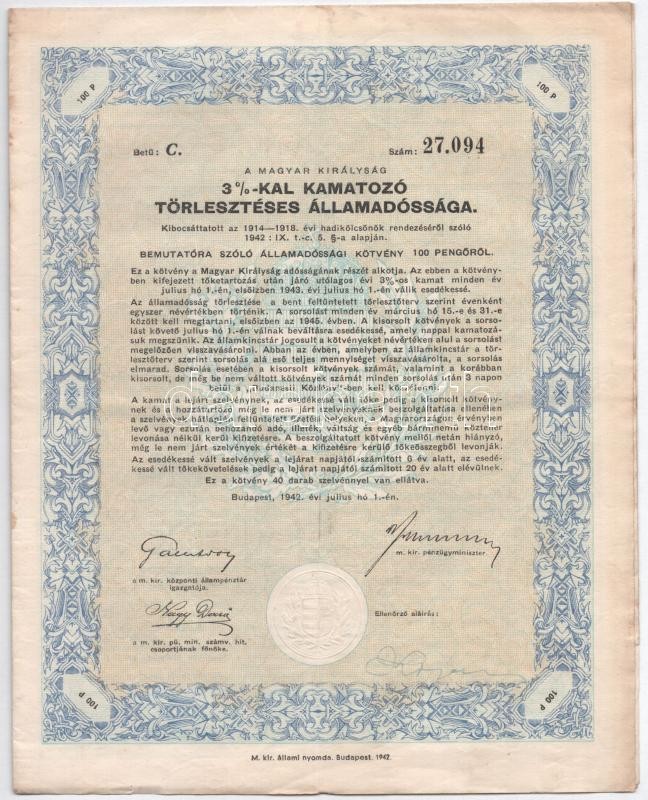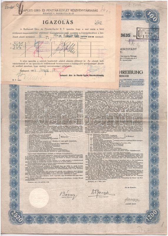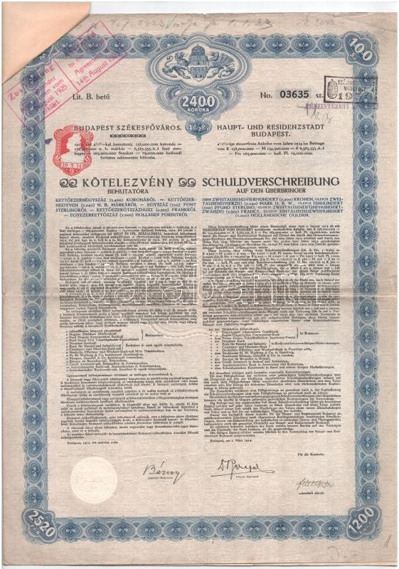 Budapest 1914. ‘Budapest Székesfőváros – Kötelezvény’ 2400K-ról szelvényekkel, bélyegzéssekkel, igazolással + 1942. ‘A Magyar Királyság 3%-kal Kamatozó Törlesztéses Államadóssága’ kötvénye 100P-ről szárazpecséttel és