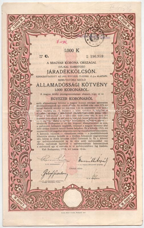 Budapest 1918. ‘A Magyar Korona Országai 5 1/2%-kal kamatozó járadékkölcsön’ államadóssági kötvénye 1000K-ról (2x) sorszámkövetők ‘C 196.958 – C 196.959’ szelvényekkel, bélyegzéssel, szárazpecséttel T:VF folt