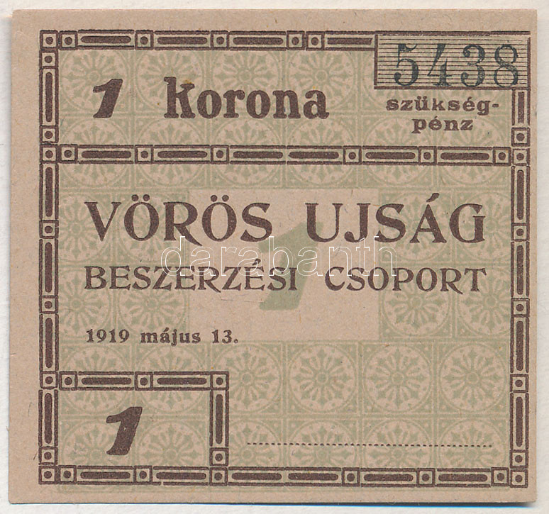 Budapest 1919. 1K ‘Vörös Ujság’ szükségpénz T:I- fo Adamo BUC300.2<a href="https://www.darabanth.com/hu/gyorsarveres/432/kategoriak~Numizmatika/Papir-es-fem-szuksegpenzek~1500006/Budapest-1919-1K-Voros-Ujsag-szuksegpenz-TI-fo-Adamo-BUC3002~II2779593