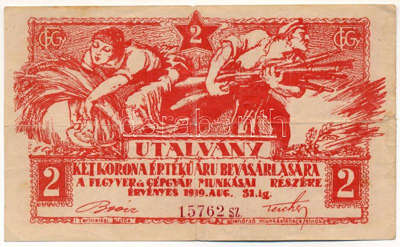 Budapest 1919. 2K ‘Fegyver és Gépgyár’ utalvány T:III szakadás, folt, középen kis anyaghiány Adamo BUC-67.2<a href="https://www.darabanth.com/hu/gyorsarveres/439/kategoriak~Numizmatika/Papir-es-fem-szuksegpenzek~500023/Budapest-1919-2K-Fegyver-es-Ge
