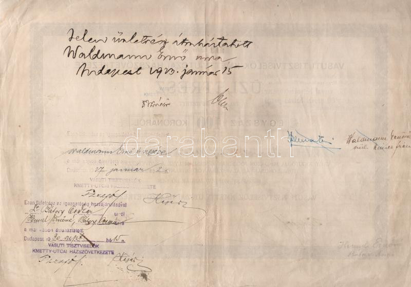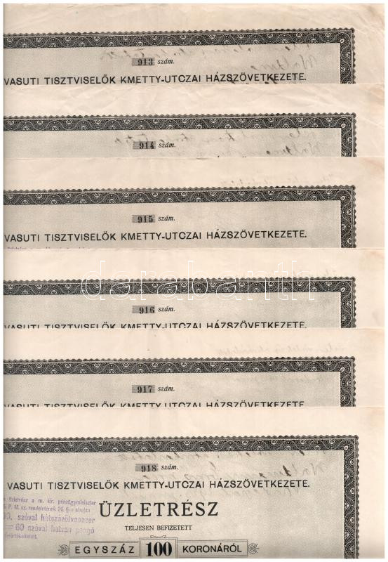 Budapest 1922. ‘Vasúti Tisztviselők Kmetty-utczai Házszövetkezete’ névre szóló üzletrész 100K-ról (6x) sorszámkövetők ‘913-918’, felülbélyegzésekkel T:II-III / Hungary / Budapest 1922. ‘Vasúti Tisztviselők Kmetty-utczai Házszövetkezete’ share about 100 Ko