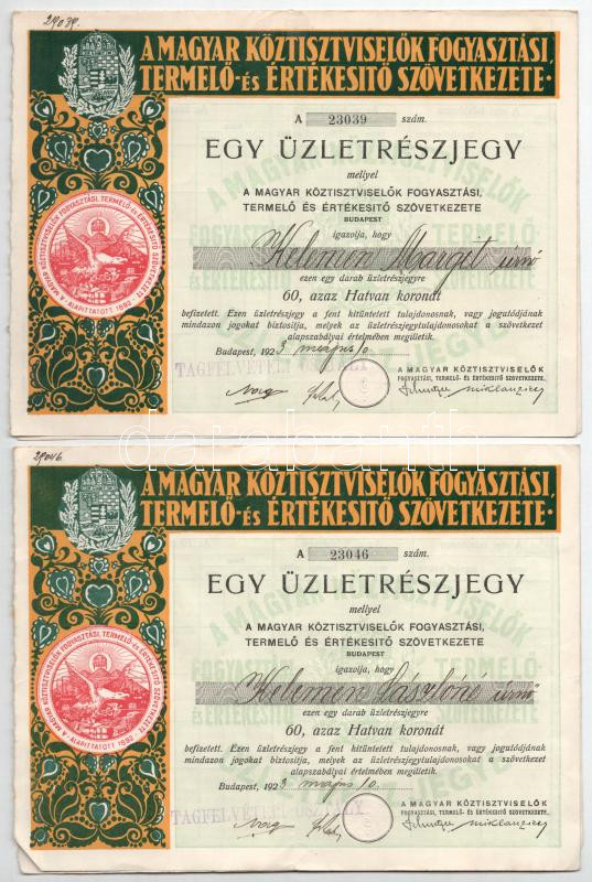 Budapest 1923. ‘A Magyar Köztisztviselők Fogyasztási, Termelő- és Értékesítő Szövetkezete’ üzletrészjegye 60K-ról, szárazpecséttel, szelvényekkel (2x) T:III folt<a href="https://www.darabanth.com/hu/gyorsarveres/436/kategoriak~Numizmatika/Reszvenyek