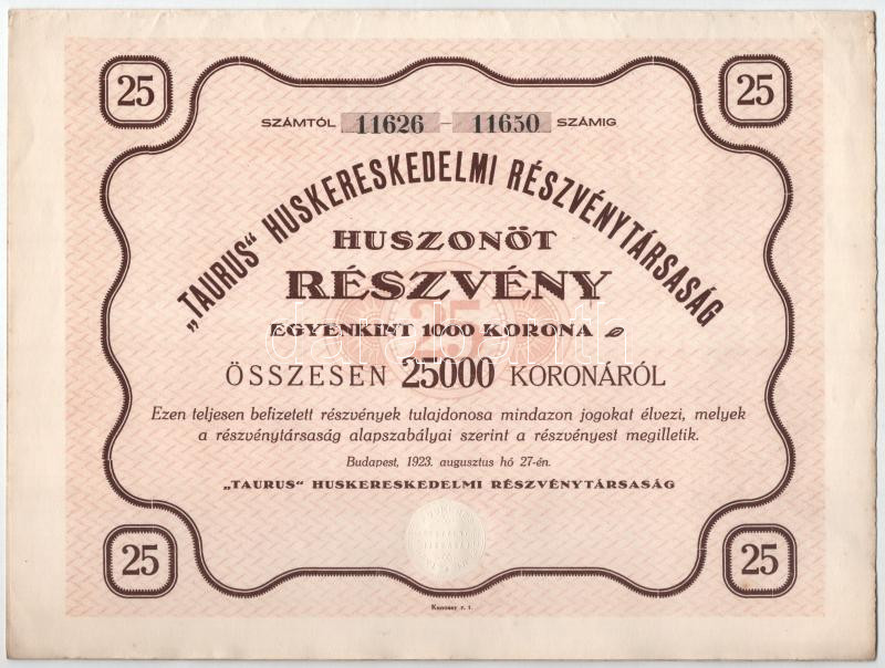 Budapest 1923. ”Taurus’ Huskereskedelmi Részvénytársaság’ huszonöt részvénye egyben, egyenként 1000K-ról, szárazpecséttel T:VF