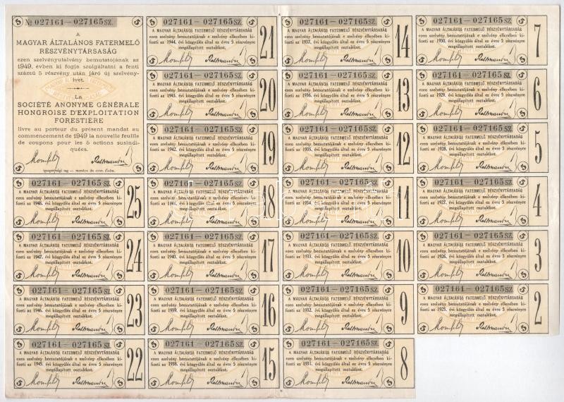Budapest 1924. ‘Magyar Általános Fatermelő Részvénytársaság’ öt részvénye egyben, egyenként 200K-ról, magyar-német-francia nyelven, szárazpecséttel, francia felülbélyegzésekkel T:III tűlyukak / Hungary / Budapest 1924. ‘Magyar Általános Fatermelő Részvény