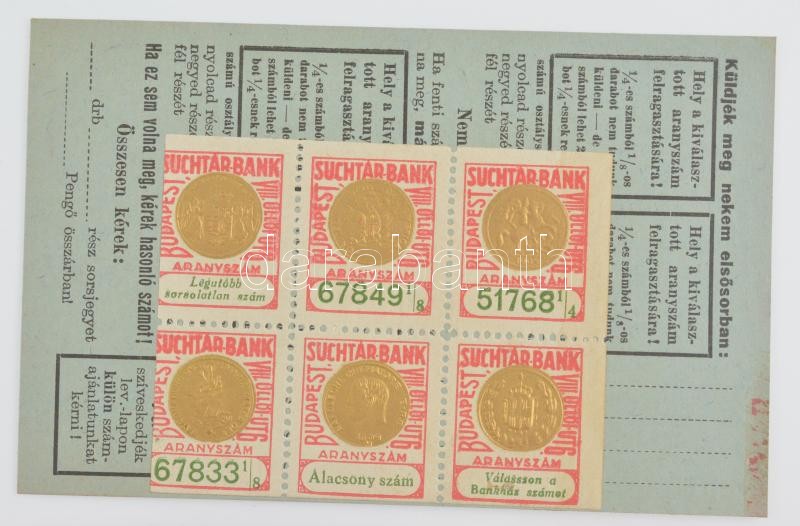 Budapest ~1935. ‘Suchtár Bankház – 35. osztálysorsjáték’ kihajtható sorsjegy reklám felbélyegzett levelezőlappal T:I- / Hungary / Budapest ~1935. ‘Suchtár Bank House – 35. Class Lottery Game’ lottery ticket advertisement with postcard and stamps C:AU<br /