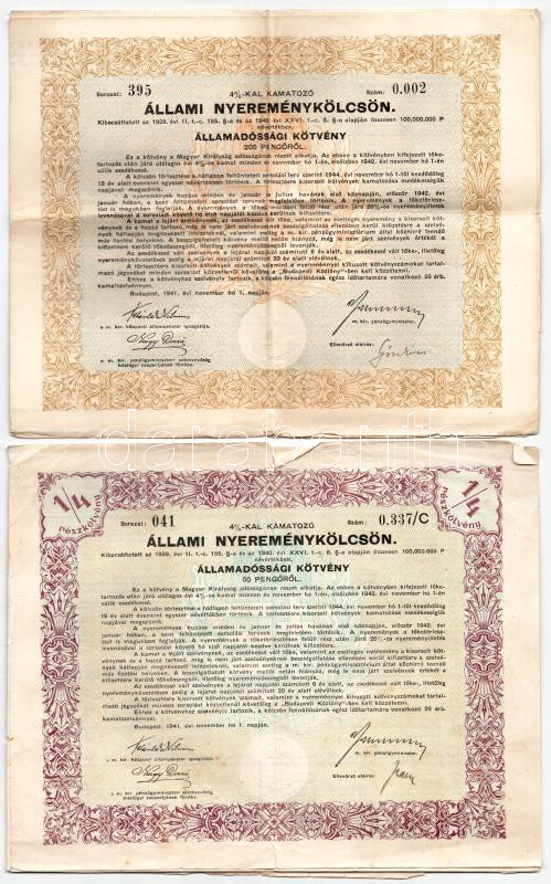Budapest 1942. ‘A Magyar Királyság 3%-kal kamatozó törlesztéses államadóssága’ államadóssági kötvény 25P-ről vízjeles papíron, szelvényekkel és szárazpecséttel + ‘A Magyar Királyság 3%-kal kamatozó törlesztéses államadóssága’ államadóssági kötvény 100P-rő