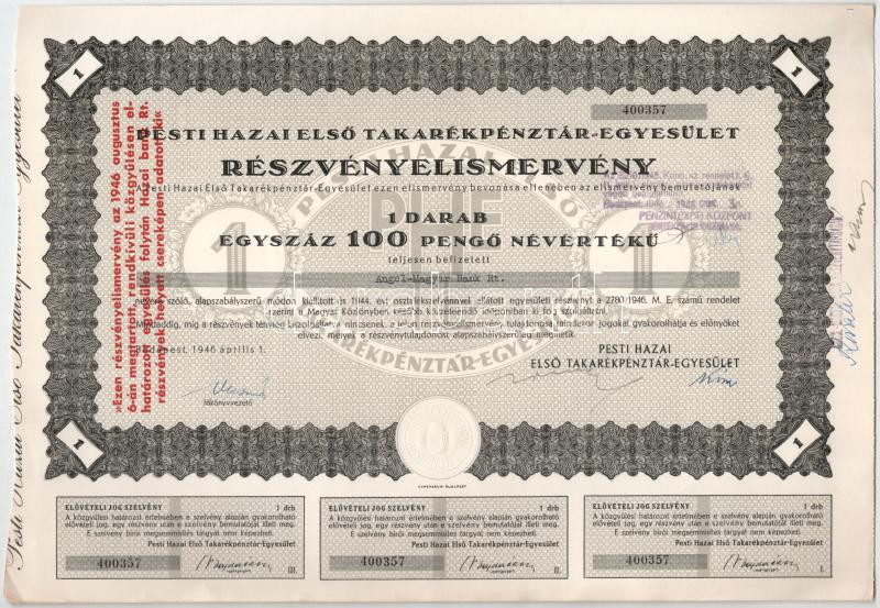 Budapest 1946. ‘Pesti Hazai Első Takarékpénztár-Egyesület’ részvényelismervénye 100P-ről szárazpecséttel, bélyegzésekkel, szelvényekkel T:AU