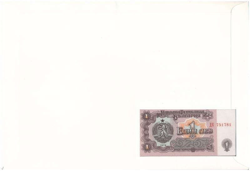 Bulgária 1974. 1L felbélyegzett borítékban, bélyegzéssel T:I Bulgaria 1974. 1 Leva in envelope with stamp and cancellation C:UNC<a href="https://www.darabanth.com/hu/gyorsarveres/433/kategoriak~Numizmatika/Ermes-es-bankjegyes-boritekok~2000018/Bulga
