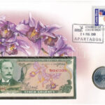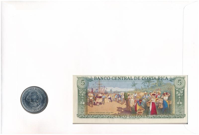 Costa Rica érmés és bankjegyes felbélyegzett boríték bélyegzéssel, benne 1975. 20C Ni ‘A központi bank 25. évfordulója’ + 1989. 5C T:1,I Costa Rica coin and banknote envelope with stamp and cancellation, in it 1975. 20 Colones Ni ’25th Anniversary of the