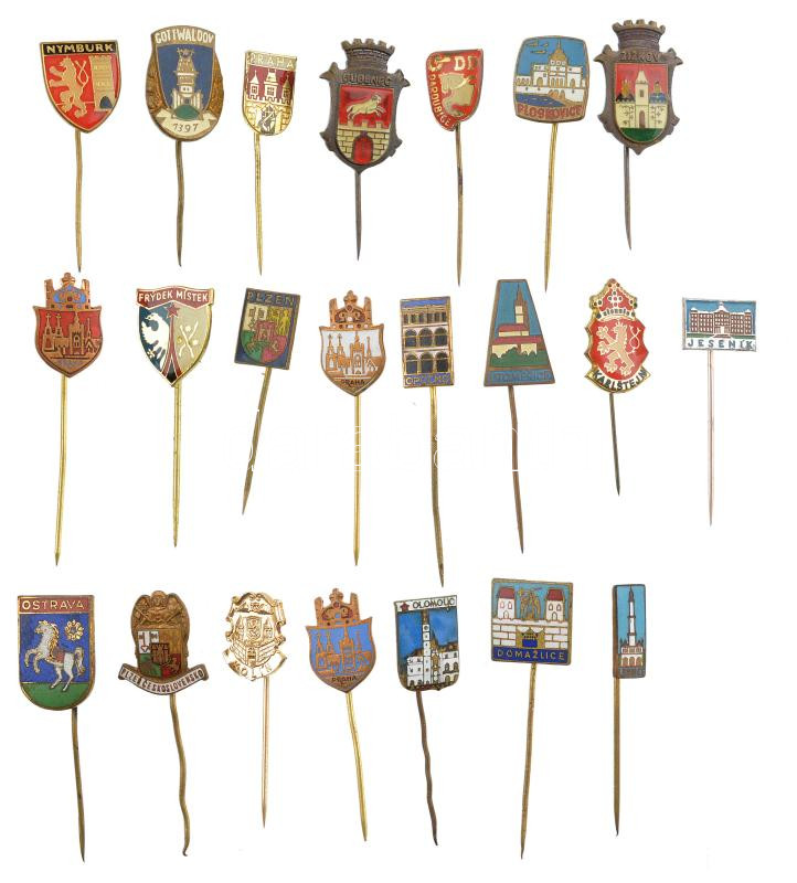 Csehország 22xklf városi fém jelvény, közte zománcozott darabokkal, közte: Prága, Olmütz, Gottwaldov (Zlín), Kolín, Plzen, Pardubice T:1-2 Slovakia 19xdiff metal city badges, within some enamelled pcs, within: Prague, Olomouc, Gottwaldov (Zlín), Kolín, Pl