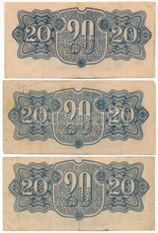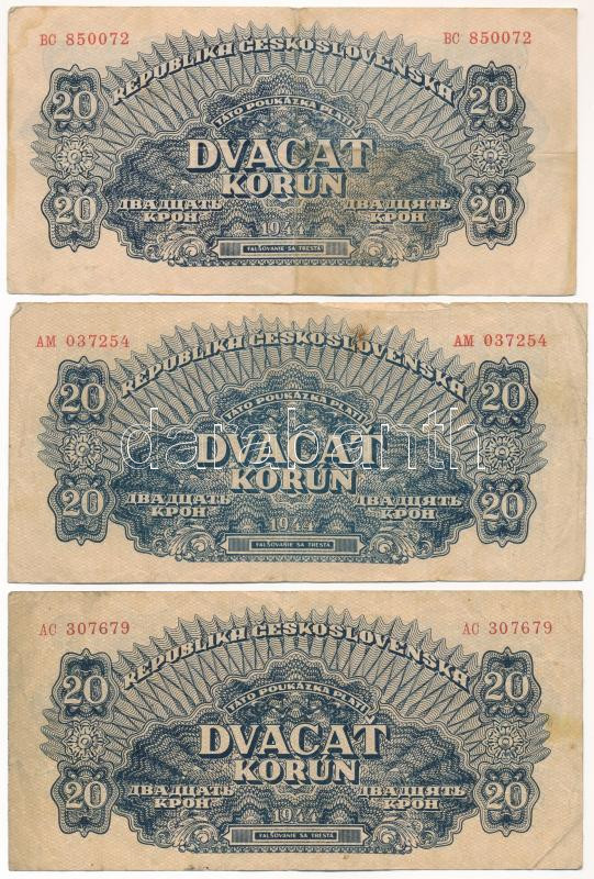 Csehszlovákia 1919. 1K + 1944. 5K + 20K (3db) T:III-IV Czechoslovakia 1919. 1 Korunu + 1944. 5 Korun + 20 Korún (3pcs) C:F-G<a href="https://www.darabanth.com/hu/gyorsarveres/432/kategoriak~Numizmatika/Kulfoldi-bankjegyek~1500014/Csehszlovakia-1919-
