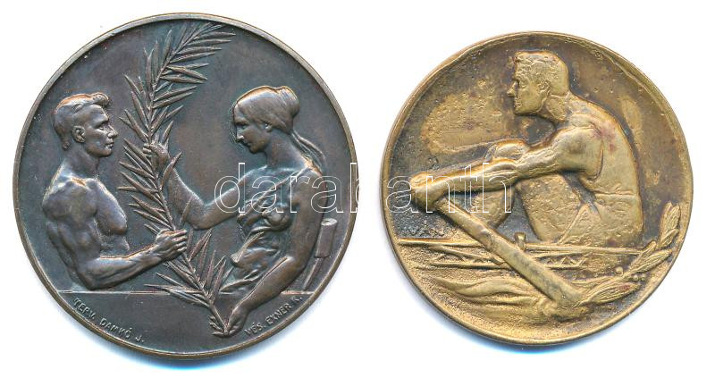 Damkó József (1872-1955) / Exner Károly (1850-1919) 1943. ‘Magyar Országos Torna Szövetség’ kétoldalas bronz díjérem, ‘ORSZ. EGY. CSAP. BAJN. 1943. 2.’ gravírozással (45mm) + 1951. ‘Vasas regatta 1951. III.’ kétoldalas bronz díjérem