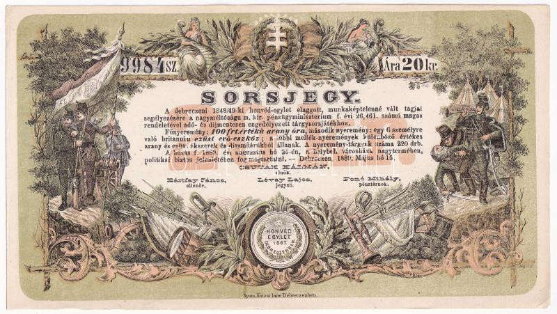 Debrecen 1889. ‘A debreczeni 1848/49-ki honvéd-egylet elaggott, munkaképtelenné vált tagjai segélyezésére’ sorsjegy 20kr értékben T:I-,II / Hungary / Debrecen 1889. ‘To help the members of the Hungarian Association of the Debrecen of