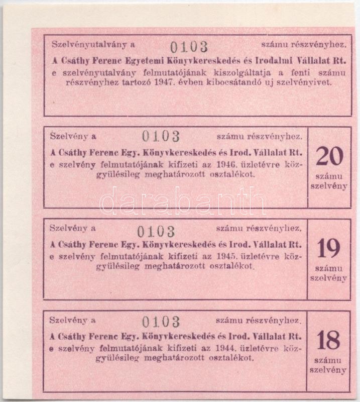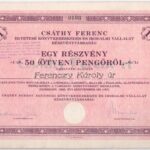 Debrecen 1926. ‘Csáthy Ferenc Egyetemi Könyvkereskedés és Irodalmi Vállalat Részvénytársaság’ névre szóló részvénye 50P-ről, szelvényekkel, szárazpecséttel T:I- fo.<a href="https://www.darabanth.com/hu/gyorsarveres/422/kategoriak~Numizmatika/Reszven