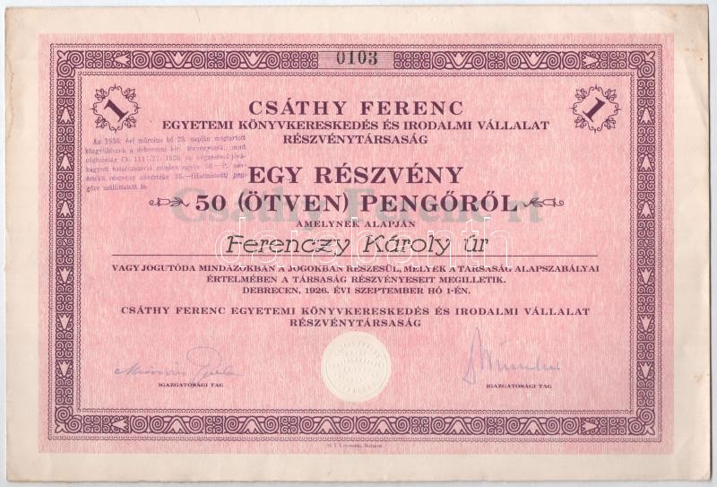 Debrecen 1926. ‘Csáthy Ferenc Egyetemi Könyvkereskedés és Irodalmi Vállalat Részvénytársaság’ névre szóló részvénye 50P-ről, szelvényekkel, szárazpecséttel T:I- fo.