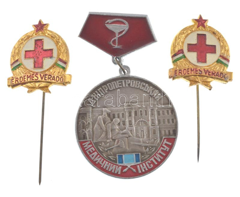 DN ‘Érdemes Véradó’ aranyozott, zománcozott fém jelvény (2db) + Ukrajna DN ‘Dnyipropetrovszki Orvosi Intézet’ Al jelvény T:1-<a href="https://www.darabanth.com/hu/gyorsarveres/436/kategoriak~Numizmatika/Falerisztika-Kituntetesek-jelvenyek~2500006/DN