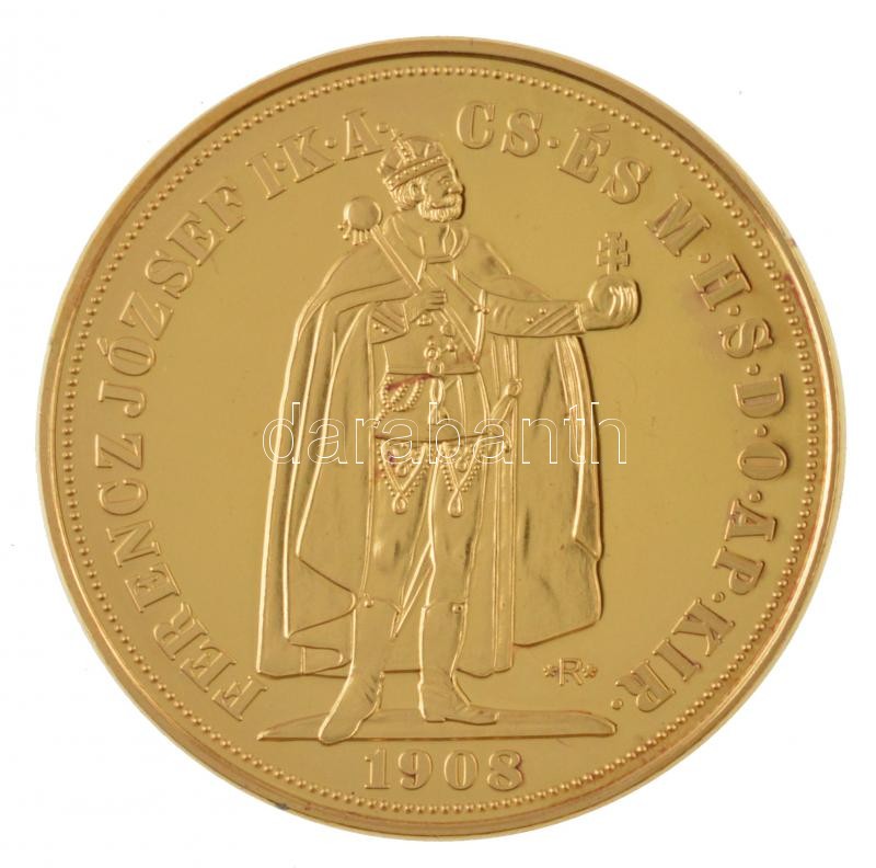 DN ‘Magyarok Kincstára – Ferenc József, 100 korona, 1908’ aranyozott rézötvözet utánveret tanúsítvánnyal, kapszulában (36mm) T:PP
