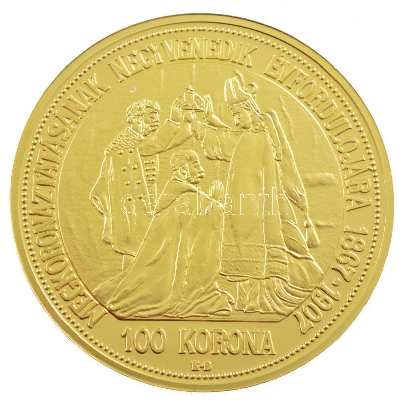 DN ‘Történelmi aranypénzek – 1907. 100K Ferenc József Megkoronázásának Negyvenedik Évfordulójára’ aranyozott Cu-Zn utánveret ‘COPY’ beütéssel, kapszulában (38mm) T:PP