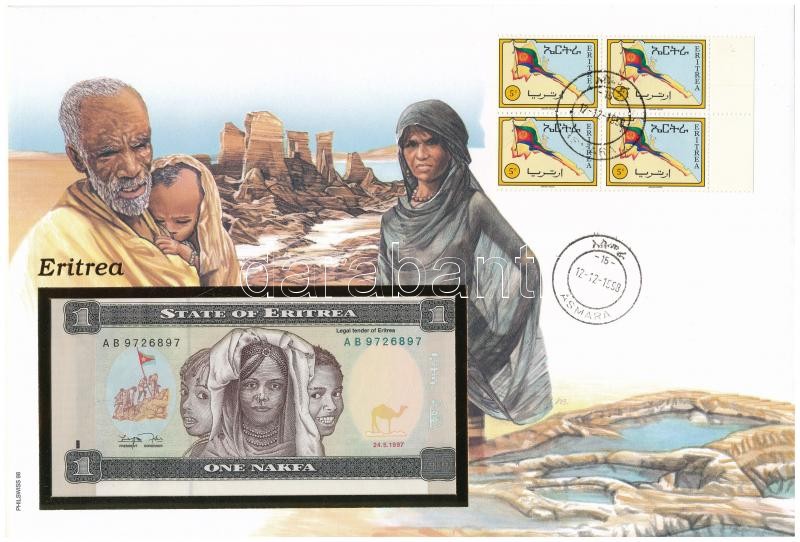 Eritrea 1997. 1N felbélyegzett borítékban, bélyegzéssel T:I Eritrea 1997. 1 Nakfa in envelope with stamp and cancellation C:UNC<a href="https://www.darabanth.com/hu/gyorsarveres/415/kategoriak~Numizmatika/Ermes-es-bankjegyes-boritekok~2000004/Eritre