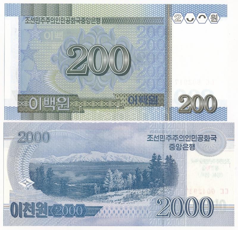 Észak-Korea 2005. 200W + 2008. 2000W ‘A KNDK 70. évfordulója’ felülbélyegzéssel T:I North Korea 2005. 200 Won + 2008. 2000 Won with ’70th anniversary of the DPRK’ overprint C:UNC Krause P#48, P#CS24