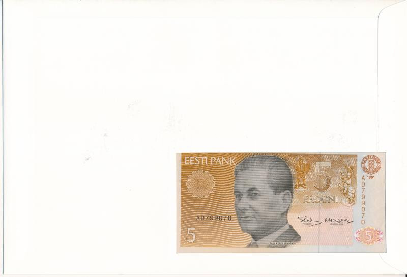 Észtország 1991. 5K felbélyegzett borítékban, bélyegzéssel T:I Estonia 1991. 5 Krooni in envelope with stamp and cancellation C:UNC<a href="https://www.darabanth.com/hu/gyorsarveres/436/kategoriak~Numizmatika/Ermes-es-bankjegyes-boritekok~1500004/Es