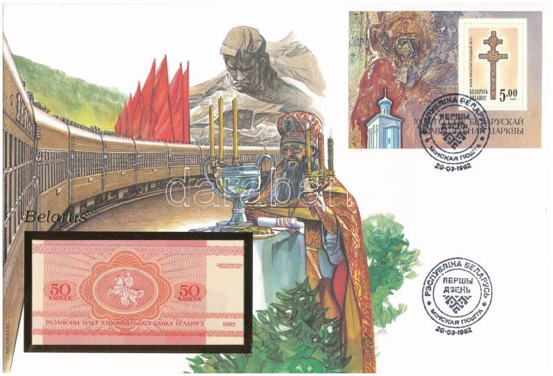 Fehéroroszország 1992. 50k felbélyegzett borítékban, bélyegzéssel T:I Belarus 1992. 50 Kapeek in envelope with stamp and cancellation C:UNC<a href="https://www.darabanth.com/hu/gyorsarveres/417/kategoriak~Numizmatika/Ermes-es-bankjegyes-boritekok~20