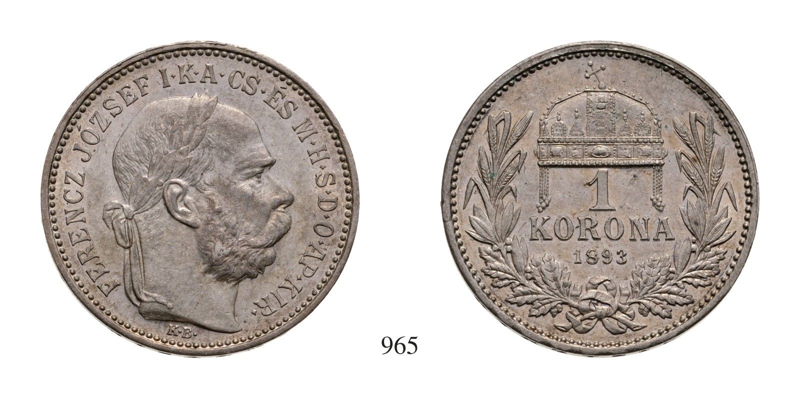 Ferenc József (1848-1916), 1 Korona , Ag , 1893, Körmöcbánya /Kremnitz/ , Av: FERENCZ JÓZSEF I•K•A•CS•ÉS M•H•S•D•O•AP• KIR• alul verdejegy /unten Mzz./ K•B• , Rv: 1 / KORONA / 1893 , 5,00 g, Huszár: 2203, Unger II.: 1495, J.: 405,Frühwald: 2115., gutes vo