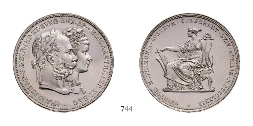 Ferenc József (1848-1916), 2 Forint – esküvôi /Doppelgulden – Hochzeit/ , Ag , 1879, Bécs /Wien/ , Av: FRANC•IOS•I•D•G•AVSTR•IMP•ET• HVNG•REX•AP•ELISABETHA•IMP•ET •REG• kettôs portré jobbra /Doppelporträit n.r./ , Rv: QVINTVM•MARTIMONII •LVSTRVM•CELEBRANT