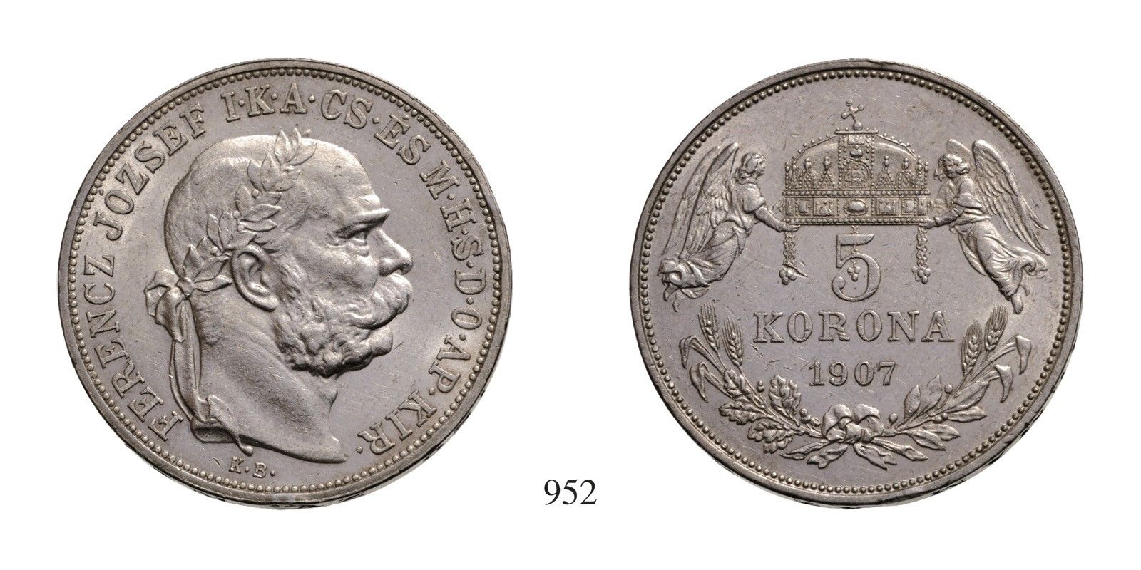 Ferenc József (1848-1916), 5 Korona , Ag , 1907, Körmöcbánya /Kremnitz/ , Av: FERENCZ JÓZSEF I•K•A•CS•ÉS M•H•S•D•O•AP• KIR• alatta verdejegy /unten Mzz./ K•B• , Rv: 5 / KORONA / 1907 , 24,07 g, Huszár: 2201, Unger II.: 1492, J.: 407, Frühwald: 2108., fas