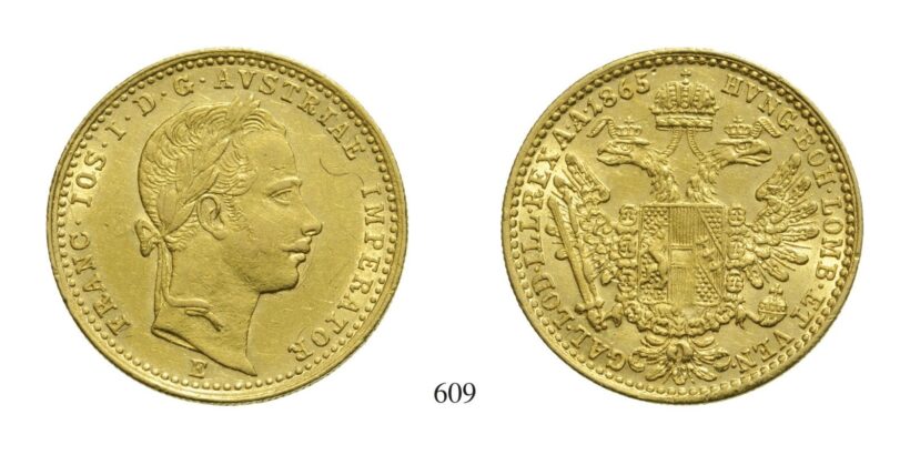 Ferenc József (1848-1916), Dukat , Au , 1865, Gyulafehérvár /Karlsburg/ , Av: FRANC•IOS•I•D•G•AVSTRIAE IMPERATOR alul verdejegy /unten Mzz./ E , Rv: HVNG•BOH•LOMB•ET VEN• – GAL•LOD•ILL•REX A•A•1865 , 3,46 g, Huszár: 2102, Unger II.: 1434b, J: 330, Frühwal