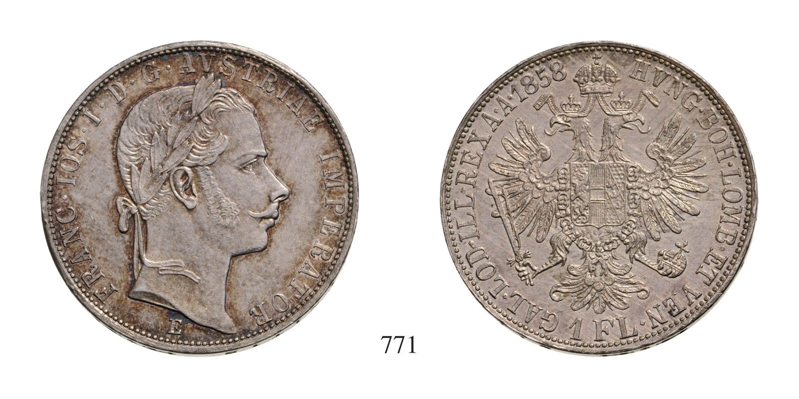Ferenc József (1848-1916), Forint /Gulden/ , Ag , 1858, Gyulafehérvár /Karlsburg/ , Av: FRANZ•JOS•I•D•G•AVSTRIAE IMPERATOR alul verdejegy /unten Mzz./ E , Rv: HVNG•BOH•LOMB•ET VEN•GAL•LOD•ILL•REX A•A•1858 , 12,35 g, Huszár: 2131, Unger II.: 1460b, J.: 328