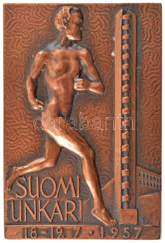 Finnország 1957. ‘Finnország-Magyarország – 1957. 07. 18-19.’ bronz atlétikai díjplakett ‘Kulta ja Hopea Oy Turku’ gyártói jelzéssel és ‘III. P. 400m aitaj’ gravírozással a hátoldalán (50x75mm) T:1- patina Finland 1957. ‘Finland-Hungary – 18-19. 7. 1957 (