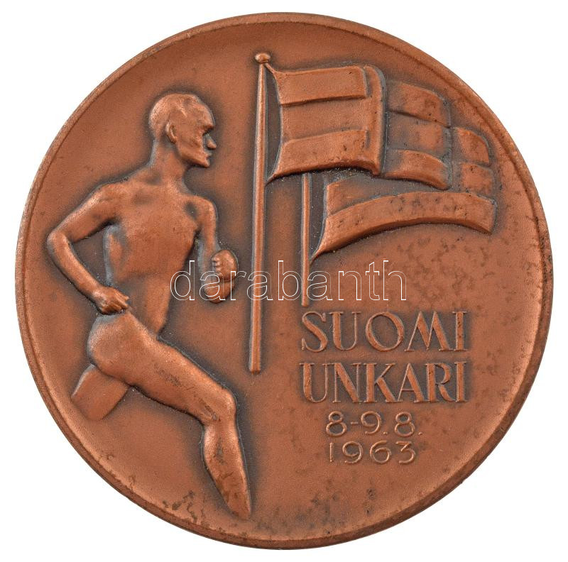 Finnország 1963. ‘Finnország-Magyarország – 1963. 08. 8-9.’ bronz atlétikai díjérem ‘Kulta ja Hopea Oy Turku’ gyártói jelzéssel és ‘IV. P. Korkeush’ gravírozással a hátoldalán (58mm) T:1-,2 patina Finland 1963. ‘Finland-Hungary – 8-9. 8. 1963 track and fi