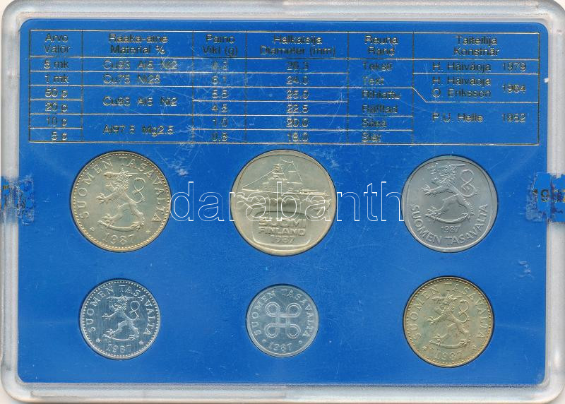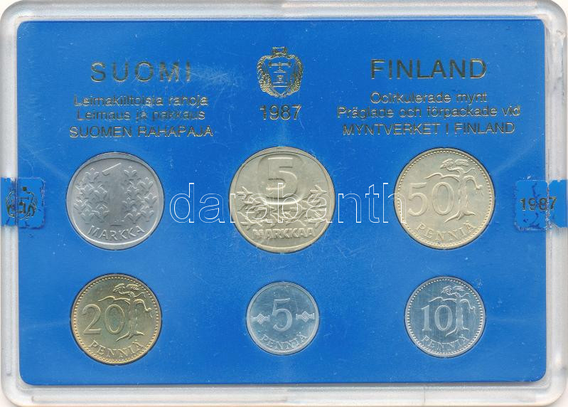 Finnország 1987. 5p-5M (6xklf) forgalmi sor sérült plasztik tokban T:1 Finland 1987. 5 Pennia – 5 Markka (6xdiff) coin set in damaged plastic case C:UNC<a href="https://www.darabanth.com/hu/gyorsarveres/439/kategoriak~Numizmatika/Kulfoldi-fem-es-ezu