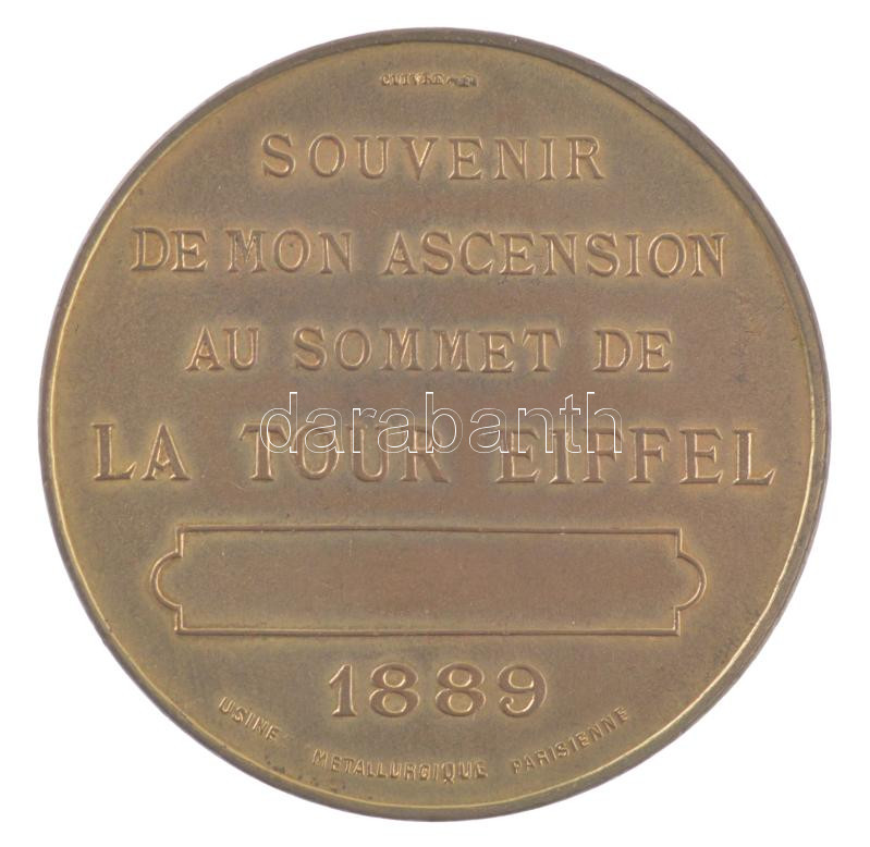 Franciaország 1889. ‘Emléktárgy az Eiffel-torony csúcsára való felemelkedésemről’ kétoldalas, aranyozott Cu emlékérem. Szign.: L. Trotin (42,5mm) T:1- kis ph. France 1889. ‘Souvenir of my Ascent to the Eiffel Tower’ two-sided, gilt Cu medallion. Sign: L.