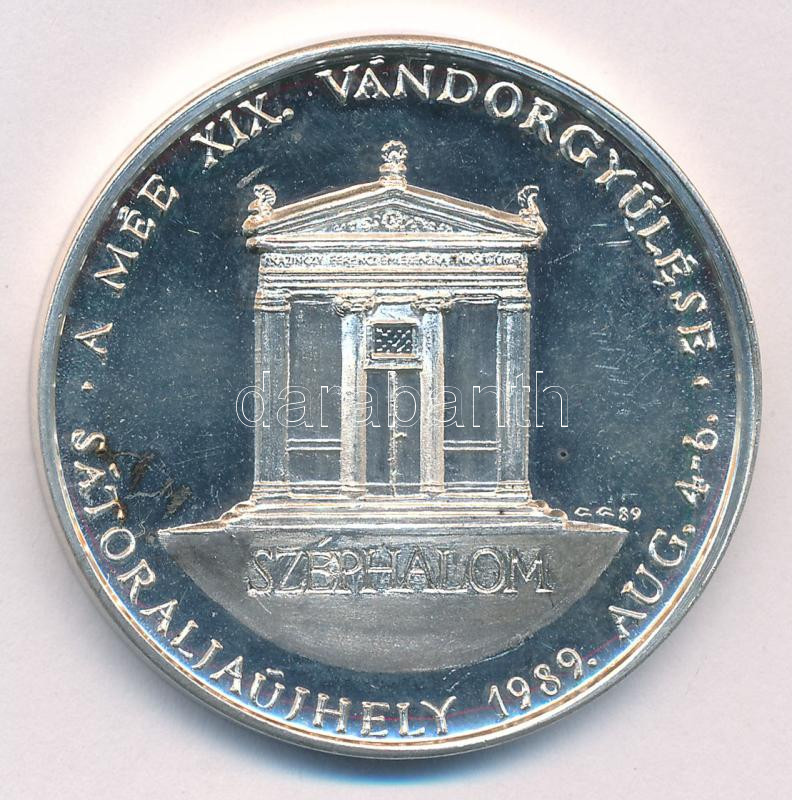 Gáti Gábor (1937-) 1989. ‘MÉE XIX. Vándorgyűlés Sátoraljaújhely / Kazinczy Ferenc’ jelzett Ag emlékérem (35,15g/0.835/42,5mm) T:1-,2 (PP)<a href="https://www.darabanth.com/hu/gyorsarveres/434/kategoriak~Numizmatika/Magyar-emlekveretek-plakettek~1500