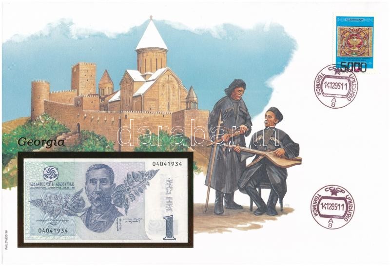 Grúzia 1995. 1L felbélyegzett borítékban, bélyegzéssel T:I Georgia 1995. 1 Lari in envelope with stamp and cancellation C:UNC<a href="https://www.darabanth.com/hu/gyorsarveres/417/kategoriak~Numizmatika/Ermes-es-bankjegyes-boritekok~2000005/Gruzia-1